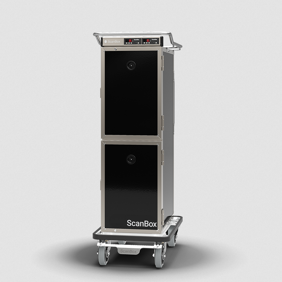 Ergo Line Combo H6+H6 is a light weight, yet heavy duty, cart for holding and transportation of hot food with GN1/1 capacity. One cart but two separate compartments that each hold 6 runners. Equipped with fan heating system (F) which provides fast and uniform heating. User friendly temperature controller with infinitely variable temperature setting up to +90°C. Total capacity of 12 GN1/1 containers given 65mm CC. Detachable U-shaped runners offer safe handling, easy cleaning and optimal temperature distribution. Other features are adjustable ventilation for optimal moisture control, ergonomic top frame handle and easy-to-roll 160mm castors. A ScanBox is a Scandinavian designed product made for both back and front of house, especially with the Signature option with the possibility to customize the exterior design.